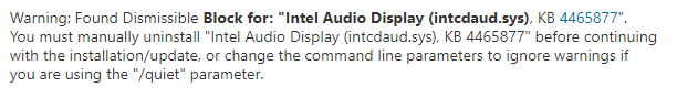 Something I’ve noticed recently when testing our Windows 10 IPU process is that a number of devices are failing the pre-cache compatibility scan with a hard block error due to an Intel Display Audio driver issue.