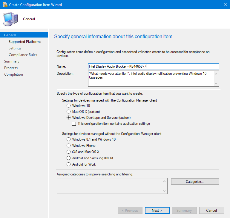 Since our client estate is rather varied, I decided the easiest way to identify all the potentially affected devices would be to create a ConfigMgr Configuration Item (CI) and Baseline (CB) which would then auto report into a Collection so I can see what needs fixing with a driver package deployment.