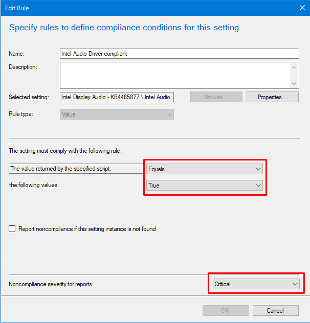 Save the script and move onto the next page to set the compliance rule. Click New to create the rule, give it name and Browse for your setting you just created. Make sure the settings are as shown and that a noncompliance severity is Critical.