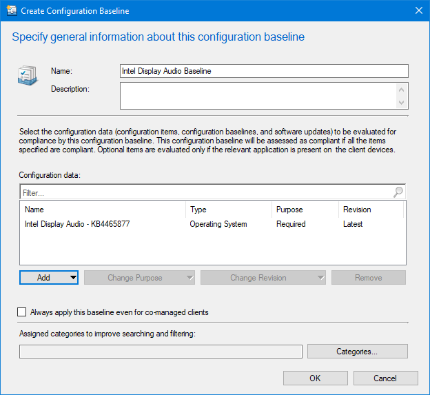Configuration Baselines are a rather powerful feature of ConfigMgr and are seriously underused in our environment. Anyway, in case you haven’t set one up before this is what I did. It might not be the best or perfect method but it’s fairly quick and works well.