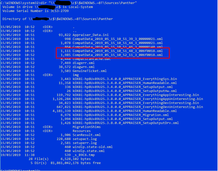 The compatibility scan fails with a rather generic error code which isn’t very helpful but if you look in a specific CompatData XML file as highlighted below that ends up in the “$WINDOWS.~BT\Sources\Panther” folder, you will see the follower warning which cause the compatibility scan to fail.